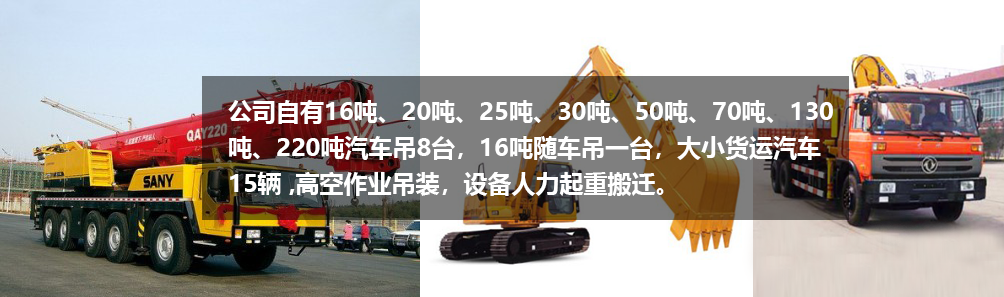 ? ????? 湘鄉(xiāng)市陽光運(yùn)輸有限公司前身由湖南鐵合金集團(tuán)汽運(yùn)公司改制重組而成。經(jīng)過多年的市場(chǎng)磨礪發(fā)展,公司設(shè)立工程機(jī)械租賃部、設(shè)備安裝維護(hù)部以及物流運(yùn)輸中心。公司自有16噸、20噸、25噸、30噸、50噸、70噸、130噸、220噸汽車吊8臺(tái),16噸隨車吊一臺(tái),大小貨運(yùn)汽車15輛 ,高空作業(yè)吊裝,設(shè)備人力起重搬遷。公司地理位置優(yōu)越,實(shí)力雄厚,歷史悠久,有二十幾年吊裝行業(yè)的經(jīng)驗(yàn)。 公司的理念:精誠團(tuán)結(jié),精益求精,客戶的滿意就是我們最大的愿望! ...